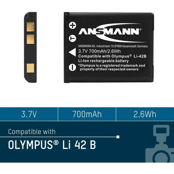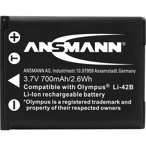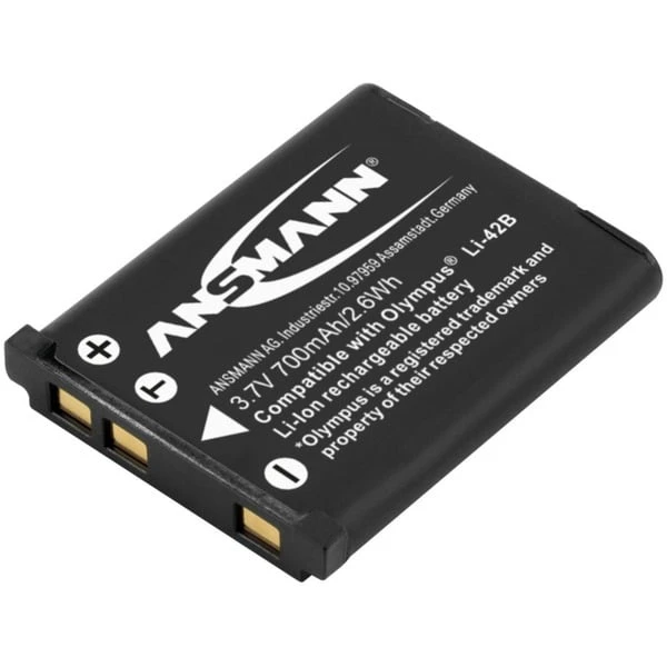 Der Digitalkamera-Akku Ansmann A-Oly Li 42B Akku für die Kameramodelle Mju 700, 720 SW, 725 SW, 730, 740, 750, FE 160 und FE 190 von Olympus. Er hat eine Spannung von 3,7 Volt und eine Kapazität von 650 mAh.Art.-Nr.: 987382