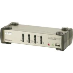 Der KVM-Switch CS1734B von ATEN ist die Lösung um vier Computer mit nur einer Tastatur, Maus und Bildschirm zu steuern. Die Bedienung erfolgt sehr komfortabel per Hotkey an der Tastatur, über die Maus oder über Taster am Switch mit acht LEDs, die den aktuellen Status anzeigen. Die Computer werden jeweils mit einer USB-Buchse und einer VGA-Buchse mit dem CS1734B verbunden, der wiederrum zwei USB-Buchsen, und eine VGA-Buchse für die gemeinsame Tastatur, Maus und den Bildschirm bereitstellt. Zudem verfügt der CS1734B über einen USB-Hub mit zwei Ports und über Audio-Anschlüsse um Lautsprecher und ein Headset zu verbinden.Art.-Nr.: 783094