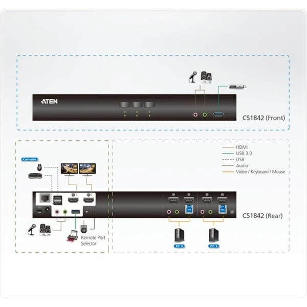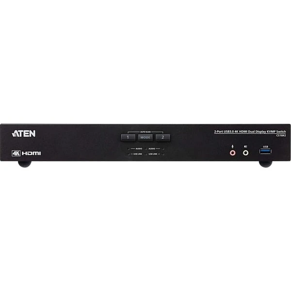 Der ATEN CS1842 Dual Display KVMP™ Switch stellt eine wertvolle Lösung für Desktop Workstations mit sofortigem und mühelosem Zugriff auf zwei Computer mit HDMI Schnittstelle über eine einzige USB-Tastatur, eine Maus und zwei HDMI-Monitore dar. Um den Anforderungen der Benutzer gerecht zu werden, entspricht der CS1842 dem HDMI 2.0 Standard und unterstützt eine überragende Videoqualität bis zu 4K DCI (4096 x 2160 bei 60 Hz), die eine überwältigende und lebendige Darstellung bietet. Darüber hinaus sorgt die patentierte ATEN Technologie – Video DynaSync™, welche die Bildschirmauflösung optimiert, das Umschalten zwischen Systemen beschleunigt und sicherstellt, dass Fenster, die auf einem erweiterten Desktop geöffnet werden, beim Umschalten zwischen Anschlüssen nicht in ihre Standardkonfigurationen auf dem Hauptbildschirm zurückkehren, für ein reibungsloses und unterbrechungsfreies Benutzererlebnis. Ein integrierter USB 3.1 Gen 1 Hub bietet Datenübertragungsraten von bis zu 5 Gbit/s und ermöglicht es Ihnen, den Betrieb zu beschleunigen und USB-Peripheriegeräte effizient gemeinsam zu nutzen.