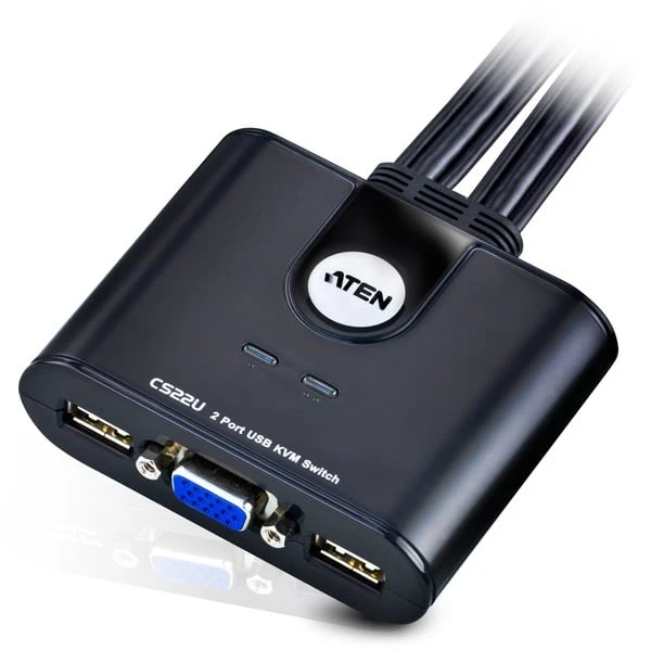 Der KVM-Switch CS22U von ATEN ist die Lösung um zwei Computer mit nur einer Tastatur, Maus und Bildschirm zu steuern. Die Bedienung erfolgt sehr komfortabel über eine 1,8 Meter lange Kabelfernbedienung mit zwei Port-LEDs, die den aktuellen Status anzeigen. Die Computer werden jeweils mit zwei USB-A-Steckern und einem VGA-Stecker mit dem 2-Port-USB-Cable-KVM-Switch CS22U verbunden, der wiederrum zwei USB-Buchsen und eine VGA-Buchse für die gemeinsame Tastatur, Maus und den Bildschirm bereitstellt. Durch die zwei USB-Anschlüsse je Computer wird keine zusätzliche Stromversorgung benötigt.Art.-Nr.: 155421