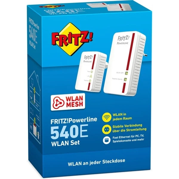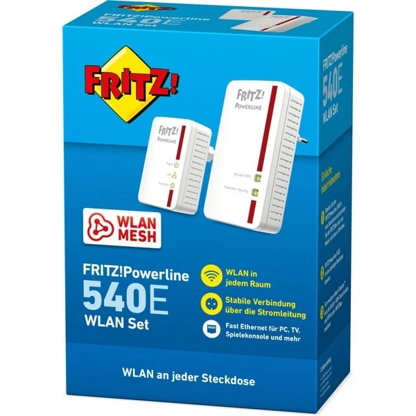 Das AVM FRITZ!Powerline 540E Set besteht aus einem FRITZ!Powerline 540E-Adapter und einem FRITZ!Powerline 510E-Adapter. Das AVM FRITZ!Powerline 540E Set erweitert das Heimnetz über die Stromleitung, ganz ohne das Verlegen von Kabeln. Der Adapter bindet Geräte auch per WLAN ins Netzwerk ein und stellt an jeder beliebigen Stelle im Haus die Verbindung zum Heimnetz und zum Internetzugang bereit. Auch Smartphones, Tablets oder Notebooks lassen sich mit FRITZ!Powerline einfach ganz einbinden.Art.-Nr.: 1126980