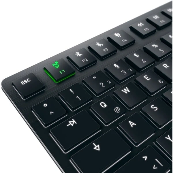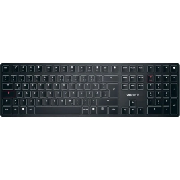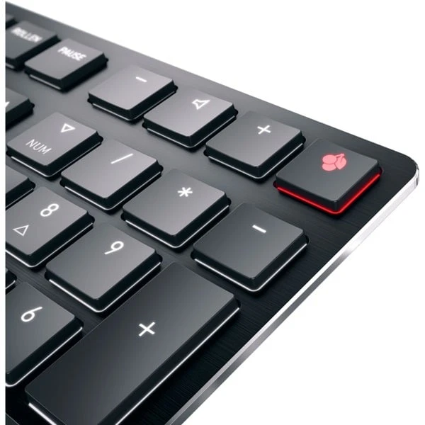| Besonderheiten | Multi-Device-Tastatur (2 Bluetooth-5.2-Kanäle, 1 2,4-GHz-Funk- und 1 Kabelkanal für bis zu 4 Geräte), farbige LEDs für Status- und Sondertasten, RGB-LED für Ladestandsanzeige in der CHERRY Taste, AES-128 Verschlüsselung, eloxierte Aluminiumplatte, Polycarbonat-Tastenkappen, Laserbeschriftung + UV Beschichtung, integrierter Lithium-Akku | ||