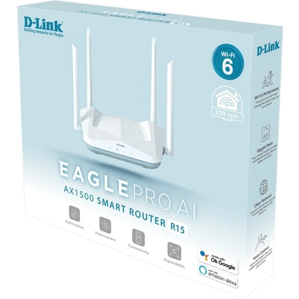 Der D-Link R15 ist ein Dualband 2×2 Wi-Fi 6 Router und bietet blitzschnelle Konnektivität mit erhöhter Reichweite und Zuverlässigkeit. Mit bis zu 1201 Mbit/s (5 GHz) und 300 Mbit/s (2,4 GHz) Geschwindigkeiten sorgt er für rasante WiFi Datenübertragungsraten und mit der Mesh-Fähigkeit mit anderen Eagle Pro AI-Geräten wird für gute Abdeckung im gesamtem Netzwerk gesorgt.