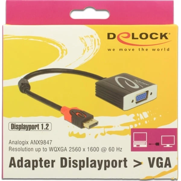 | Hinweis | Chipsatz: Analogix ANX9847, Displayport 1.2 Spezifikation, VGA Anschluss mit Muttern, Auflösung bis WQXGA 2.560 x 1.600 @ 60Hz (abhängig vom System und der angeschlossenen Hardware), Pixel Taktfrequenz bis zu 270 MHz, dreifacher 8 Bit Digital zu Analog Wandler (DAC), 1x Ferritkern | ||