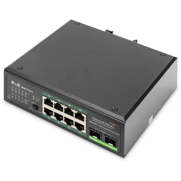 Der DIGITUS Industrial Gigiabit PoE-Switch ist für raue Umgebungen entworfen, in denen sie Feuchtigkeit, Temperaturschwankungen und Vibrationen ausgesetzt sind. Mit einem Temperaturbereich von -40°C bis 75°C ist der Industrial Gigabit PoE-Switch unter den widrigsten Bedingungen einsetzbar. Durch die PoE-Ports mit IEEE802.3af/at Unterstützung können PoE-fähige Geräte mit bis zu 30 W je Port versorgt werden. Es ist eine ständige Verfügbarkeit in den hochsensiblen Bereichen wie Transport, Produktion, Verkehr und Sicherheitsüberwachung gewährleistet. Durch das einfache Plug-and-Play-System kann eine schnelle Einbindung des Industrial Gigabit PoE-Switch in das jeweilige Umfeld erfolgen. Durch die Gigabit Konnektivität, sowie der SFP Uplink-Ports, stellt der Industrial Gigabit PoE-Switch somit eine flexible, kostengünstige Lösung für das industrielle Umfeld dar.