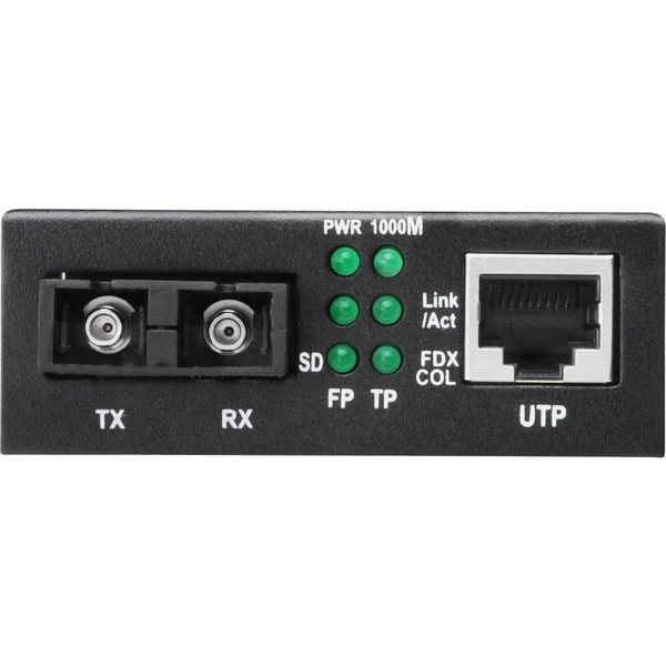 Der Digitus Gigabit Medienkonverter RJ-45 auf SC-Duplex wandelt drahtbasierte 1000Base-TX-Netzwerksignale in 1000Base-SX-Glasfasersignale um. Dabei bietet er eine maximale Reichweite von bis zu 500 Metern. Die Wellenlänge liegt sowohl beim Senden als auch beim Empfangen bei 850 nm. Als Standalone-Gerät mit externem Netzteil braucht der Gigabit Medienkonverter RJ-45 auf SC-Duplex auch nicht in ein Rack eingebaut werden. Weiterhin sind automatische Kabelerkennung, Auto-Erkennung von Voll- und Halb-duplex sowie Diagnose-LEDs für die Status- und Aktivitätsüberwachung verfügbar. Der Gigabit Medienkonverter RJ-45 auf SC-Duplex eignet sich für 50/125 µm und 62,5/125 µm Multimode-Glasfaserkabel.Art.-Nr.: 919802