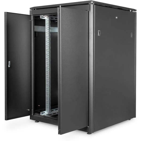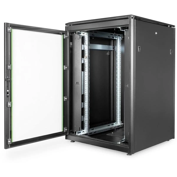 Die Netzwerkschrank Unique Serie wurde für Verkabelung und Netzwerkkomponenten entwickelt und produziert. Verschiedenste Optimierungen führen zu einer optimalen Leistung in Qualität und Mehrwert. Die Schränke sind benutzerfreundlich konzipiert und ästhetisch im Aussehen. Die Fronttür besteht aus einem kompletten Metallrahmen mit Sicherheitsglas. Der abschließbare Schwenkhebelgriff ist vorbereitet für die Aufnahme von Profilhalbzylindern (Adapter liegt bei). Alle Seitenteile sind abschließbar und können leicht abgenommen werden. Jeder Schrank beinhaltet galvanisierte 483 mm (19“)-Profilschienen, montiert vorne und hinten im Schrankinneren. Sie sind tiefenverstellbar und besitzen eine Markierung der jeweiligen Höheneinheit. Die vertikalen Kabelführungskanäle sind neben den vorderen Profilschienen verbaut (bei Schränken ab 800 mm Breite). Sie bieten eine einfache Führung von Patch- und Installationskabeln. Das Dach ist vorbereitet zur Aufnahme einer Lüftereinheit. Die komplett montierten 483 mm (19“)-Schränke sind in verschiedenen Höheneinheiten von 22HE bis zu 47HE und einer Breite von 600 oder 800 mm und einer Tiefe von 600, 800 oder 1000 mm erhältlich. Standardfarbe Grau (RAL 7035) und Schwarz (RAL 9005).Art.-Nr.: 1364546