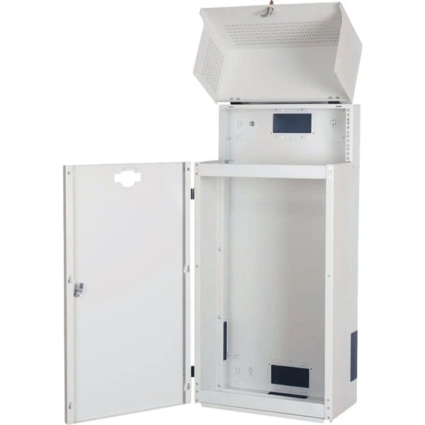 | Feature | Zwei separat abschließbare Bereiche der Fronttür, oberer Bereich mit 4HE horizontalem und 6HE vertikalem 483 mm (19“)-Bereich, stabiles geschweißtes Gehäuse, Bodenteil standardmäßig mit Lüftungsblech, optionaler Lüfter verfügbar | ||