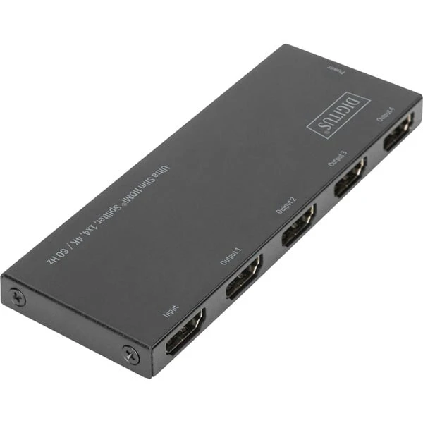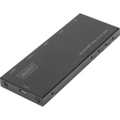 Der Digitus Ultra Slim HDMI Splitter, 1×4, 4K / 60 Hz verteilt Audio- und Videosignale des HDMI-Gerätes auf bis zu vier Bildschirme, Fernseher oder Beamer in einer Auflösung von UHD 4K / 60 Hz. So gehört das lästige Umstecken der Kabel der Vergangenheit an. Zusätzlich wird auch HDR, HDCP 2.2 sowie 3D unterstützt und eine Gesamtbandbreite von 18 Gbps für eine flüssige Wiedergabe in brillanter Qualität. Der HDMI Splitter kann über einen vorhandenen USB-Port am TV-Gerät oder alternativ per USB-Ladeadapter mit Strom versorgt werden. Mann kann mehrere Splitter auf bis zu 8 Ebenen kaskadieren.Art.-Nr.: 1849464