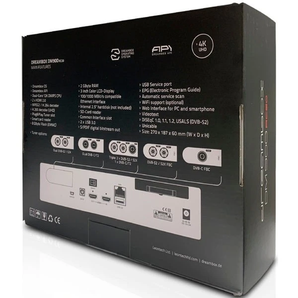 Die Dreambox DM900 RC20 UHD 4K ist ein neuer Ultra HD Receiver und zeichnet sich insbesondere durch seinen ultraschnellen Prozessor mit 12000 DMips, 8GB Flash und 2GB RAM aus. Der Receiver besitzt einen Steckplatz für Plug & Play-Tuner, so dass man die Dreambox für digitalen Satelliten-, Kabel- oder Antennenempfang (DVB-T/T2) nutzen kann. An der Front brilliert die DM900 RC20 UHD mit einem 7,62 cm (3″) Farbdisplay. Hinter einer Frontblende verbergen sich je ein Common-Interface- und ein Smartcard-Schacht. Auf der Rückseite bietet die Box zahlreiche Anschlussmöglichkeiten: HDMI Ein- und Ausgang, USB 3.0, Netzwerkschnittstelle, SPDIF (Optisch) und ein Einschub für 2,5″ Festplatten.Art.-Nr.: 1657637