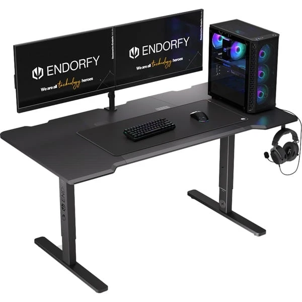 Die Tischplatte des ENDORFY Atlas L ist 150 cm breit und 78 cm tief und bietet somit bequem Platz für alles, was man braucht. Und mit einer Tragfähigkeit von bis zu 80 kg muss man sich nicht auf leichte Gegenstände beschränken. Außerdem kann man den Schreibtisch problemlos an die eigene Körpergröße und die Größe des Stuhls anpassen. Um die Einstellung zu erleichtern, sind an Innenseite der Beine Höhenmarkierungen angebracht. Man wählt einfach zwischen 72, 75, 78 oder 80 cm und schon kann man sich hinsetzen. Ein Schreibtisch mit einer großenTischplatte (150 cm x 78 cm). Sie bietet ein Maximum an Arbeitsfläche und die Möglichkeit, unnötige Kabel und Verlängerungskabel zu verstecken. Da bei sieht er dank der Tischplatte mit Karbonmuster klaase aus. Zwei verstellbare Stahlbeine sorgen dafür, dass alles an seinem Platz bleibt. Unter der Tischplatte hat Endorfy außerdem verstärkte Stützen angebracht, die Lasten von bis zu 80 kg tragen können. Es gibt sogar eine diskrete Kopfhöreraufhängung. Der Atlas L ist ein Schreibtisch, der sich in zwei Worten zusammenfassen lässt: verstellbar und ergonomisch. Man stellt die Tischplatte des Atlas einfach auf eine von vier Höhen ein (72, 75, 78 oder 80 cm). Dank der Markierungen an der Innenseite der Beine ist dies in wenigen Minuten erledigt. Dank der Gummitüllen und Kabeldurchlässe, die in der Tischplatte und in den Beinen des Atlas L versteckt sind, werden die Kabel an einem Ort gesammelt und ästhetisch zu den Steckdosen oder der Steckdosenleiste zu führen. Um das Gesamtpaket abzurunden, wurden außerdem Kunststoffbügel hinzugefügt, mit denen man widerspenstige Kabel zähmen und außer Sichtweite bringen kann. Der Schreibtisch besitzt drei Einbuchtungen an der Rückseite und einer sanft geformten Vorderkante. Dank dieser kleinen Modifikation kann man problemlos eine Monitorhalterung anbringen oder zusätzliche Kabel verlegen, ohne dass der Tisch von der Wand absteht.Art.-Nr.: 1878263
