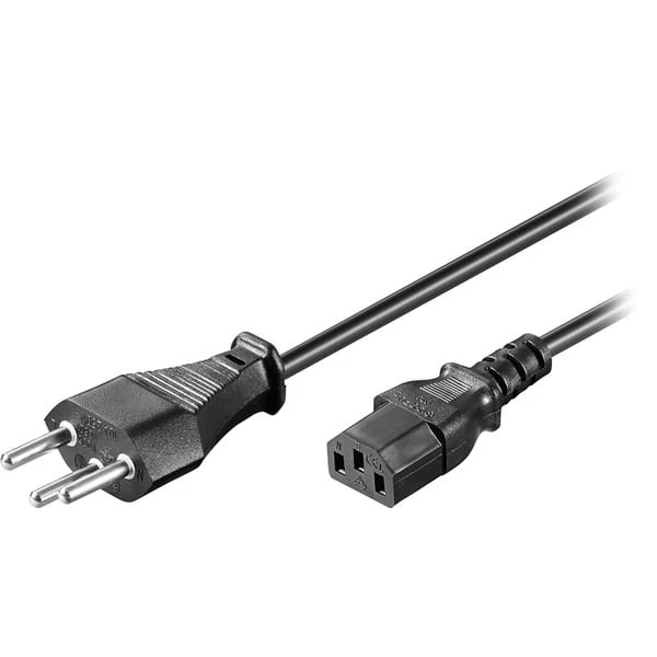 Kaltgerätekabel mit abgewinkeltem Netzstecker zum Anschluss von PCs oder Monitoren an das schweizer Stromnetz (Stecker-Typ J, max. 240 Volt).Art.-Nr.: 256566