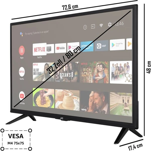 Der JVC LT-32VAH3255 ist ein kompakter AndroidTV mit 80 cm (32″) Bilddiagonale und WXGA Auflösung (1.366 x 768 Pixel), der durch zahlreiche Anschlüsse, integrierte Stereo-Lautsprecher und weiteren smarten Funktionen. Über WLAN erhält man Zugriff auf Video/Audio on Demand Angebote, einen Webbrowser, Wetter- oder Nachrichtenapps sowie Smart Home Funktionen mittels Google Assistant. Über Bluetooth lassen sich zudem sämtliche Audio-Inhalte von Smartphones, Tablets und Co. übertragen. Der JVC LT-32VAH3255 besitzt 12 Watt starke Stereo-Lautsprecher und erzeugt so eine mitreißende Atmosphäre in Spielen, Filmen, Serien und bei Musik. Als Anschlüsse stehen HDMI, VGA, USB sowie ein RJ-45 Port bereit, sodass der Fernseher auch als Monitor genutzt werden kann. Zum Fernsehen ist der LT-32VAH3255 mit einem Triple Tuner für Kabel, Satellit und terrestrische Antenne ausgestattet.Art.-Nr.: 1898641