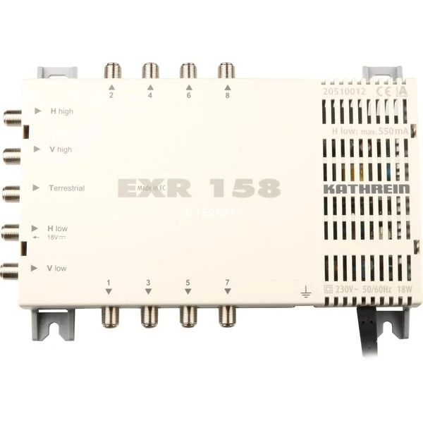 Mit dem Kathrein EXR 158 Multischalter 5/8 können acht Teilnehmer mit Satelliten-Signalen versorgt werden. An jeder Multimedia-Steckdose kann der Teilnehmer über die gesamte Vielfalt der empfangenen Programme verfügen. Mit dem dem EXR 158 Multischalter 5/8 lassen sich bis zu vier verschiedene Satelliten-ZF-Ebenen verteilen.Art.-Nr.: 961782