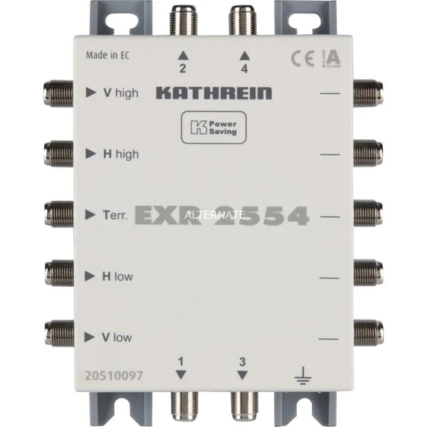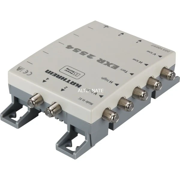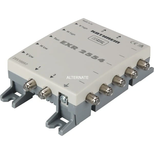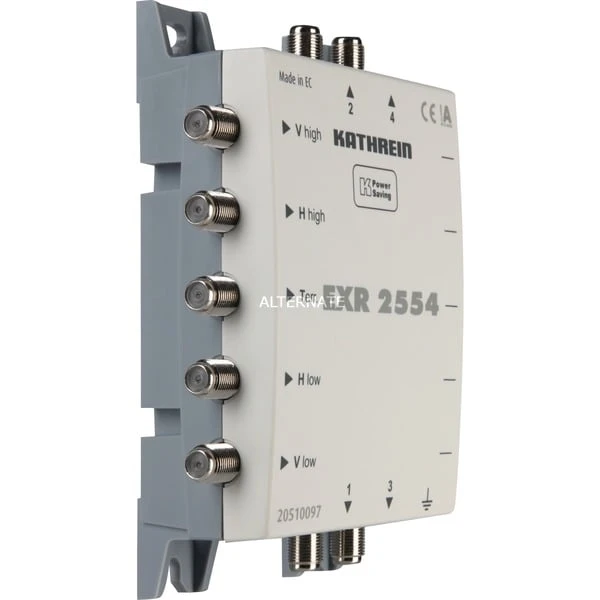Der Kathrein EXR 2554 ist ein kaskadierfähige Multischalter zur Verteilung von vier Sat-Ebenen und terrestrischer Signale auf viele Receiver, je Receiver ist nur eine Niederführung notwendig (für Twin-Receiver zwei Niederführungen). Es besteht die unabhängige Wahlmöglichkeit horizontal/vertikal, low/high von jedem Receiver aus. Die Umschaltung erfolgt über das Koaxialkabel mit 14/18 V und 0/22 kHz-Signalfrequenz. Er verfügt über einen integrierten Verstärker für geringe Anschlussdämpfungen im Sat-Bereich und eine integrierte Preemphase zum Entzerren der Kabeldämpfung. Der Empfang des terrestrischen Bereiches auch bei ausgeschaltetem Sat-Receiver möglich. Es können bis zu acht EXR 2554 kaskadiert werden. Kathrein-Power-Saving: Sobald kein Receiver mehr aktiv ist, erfolgt eine Signalisierung an den End-Multischalter über den Stamm „vertikal low“, der dann die LNB-Spannungsversorgung abschaltet.Art.-Nr.: 1258420