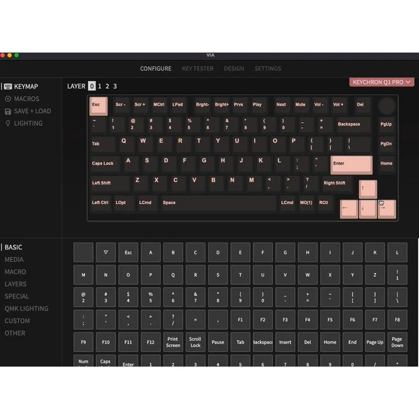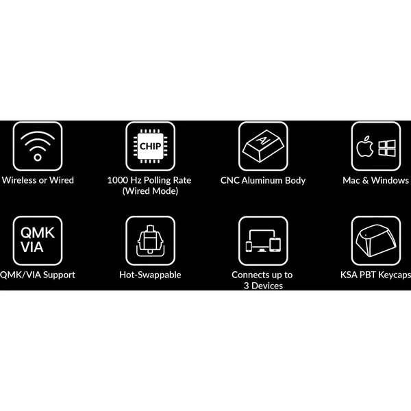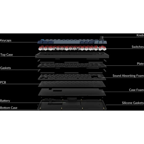 | Besonderheiten | Aluminiumrahmen (6063 Aluminium, CNC-gefräst, poliert, eloxiert, sandgestrahlt) | Double-Shot PTB-Tastenkappen (nicht durchscheinend) mit KSA-Profil (Keychron Spherical-Angle) | Programmierbarer Drehregler | Nach Süden ausgerichtete RGB-LEDs | Eingeschraubte PCB-Stabilisatoren | Vollständige QMK- und VIA-Unterstützung | macOS-Windows-Umschalter | ||