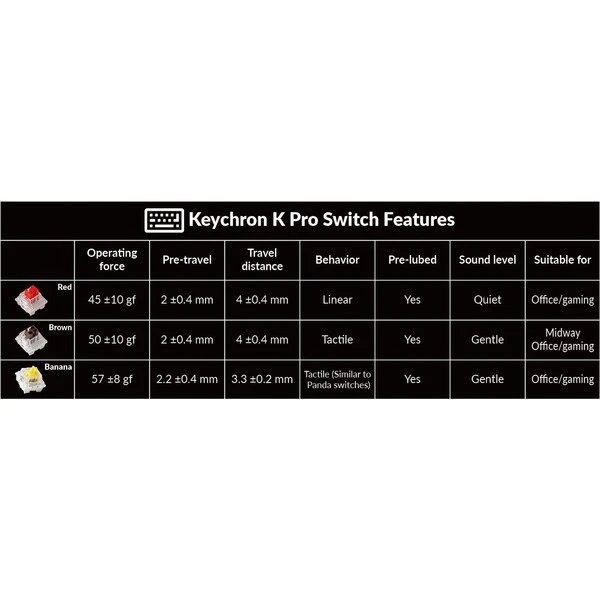 | Weitere Informationen | Vollständig montierte Tastatur inkl. Aluminiumrahmen, PCB, PC-Platte, schalldämmender Schaumstoff, Gehäuseschaumstoff, 16 Gaskets (8 vorinstalliert, 8 zusätzlich), 4 Sets an Stabilisatoren, Drehregler, 1 Set PTB-Tastenkappen und 1 Set Keychron K Pro Tastenschalter (vorgeölt) | Wiederaufladbarer 4000 mAh Li-Polymer-Akku | Akkulaufzeit: Bis zu 300 Stunden bei ausgeschalteter Hintergrundbeleuchtung, bis zu 100 Stunden bei eingeschalteter Hintergrundbeleuchtung | Bluetooth-Version: 5.1 | Polling-Rate Bluetooth: 90 Hz | Polling-Rate USB-Kabel: 1.000 Hz | ||