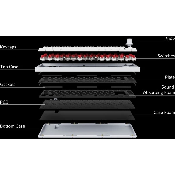 | Besonderheiten | Aluminiumrahmen (6063 Aluminium, CNC-gefräst, poliert, eloxiert, sandgestrahlt) | Durchscheinende ABS-Tastenkappen mit OSA-Profil (OEM-Höhe, SA-Form) | Programmierbarer Drehregler | Nach Süden ausgerichtete RGB-LEDs | Eingeschraubte PCB-Stabilisatoren | Vollständige QMK- und VIA-Unterstützung | macOS-Windows-Umschalter | ||