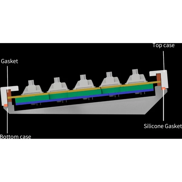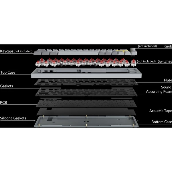 | Weitere Informationen | Barebone Keyboard Kit (ohne Tasten und Schalter): Aluminiumrahmen, PCB, Stahlplatte, 8 Gaskets (8 vorinstalliert), 3 Sets an Stabilisatoren, Akustikband | ||