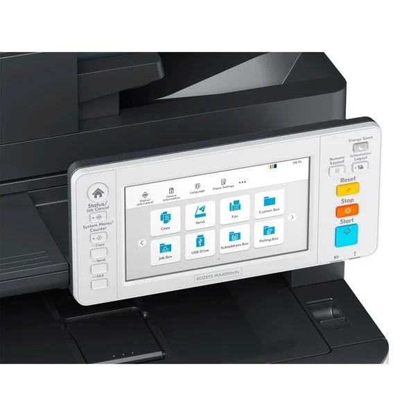 Der ECOSYS MA4000cix von Kyocera ist eine effiziente Allround-Lösung für kleine und mittlere Arbeitsgruppen. Dieser Farblaser-Multifunktionsdrucker gibt bis zu 40 Seiten pro Minute aus und verfügt außerdem über einen leistungsfähigen Scanner und Kopierer mit 100 Blatt fassendem Einzug. Außerdem ist eine leistungsfähige Fax-Schnittstelle integriert. Das Bedienkonzept überzeugt mit einem schwenkbaren Touchscreen an der Vorderseite, es sind vielfältige Sicherheitsfunktionen integriert. Das Gerät kann per LAN in bestehende Arbeitsstrukturen integriert werden und unterstützt auch den Direktdruck von Mobilgeräten mit iOS oder Android. Dank Unterstützung für Kyoceras HyPAS können Anwender eigene Java-Anwendungen einsetzen und Arbeitsprozesse etwa über angepasste Menüanzeigen oder spezielle Tastenbelegungen noch weiter optimieren.Art.-Nr.: 100006729