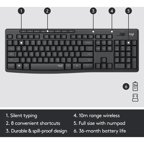 | Weitere Informationen | Abmessungen Tastatur (HxBxT): 18 x 441 x 149 mm, Gewicht (mit Batterien): 498 g | Abmessungen Maus (HxBxT): 39 x 60 x 99 mm, Gewicht (mit Batterien): 75,2 g | Abmessungen Nano-Empfänger (HxBxT): 14,4 x 18,7 x 6,1 mm, Gewicht: 1,8 g | ||