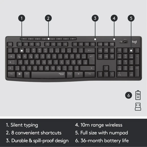 | Besonderheiten | SilentTouch-Technologie | Höhenverstellbare, spritzwassergeschützte Tastatur | Maus mit geschwungener, kompakter Form | Plug&Play | ||