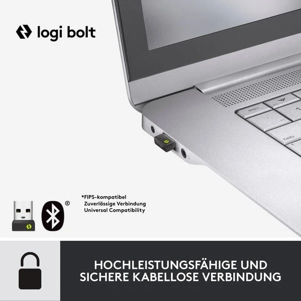 | Hinweis | Software: Logi Options+ verfügbar für Windows 10 und macOS 10.15 oder höher | Logi Bolt ist als „Sicherheitsmodus 1 – Sicherheitsstufe 4“ klassifiziert und der Logi Bolt USB-Empfänger ist bei Lieferung bereits gepairt. | ||