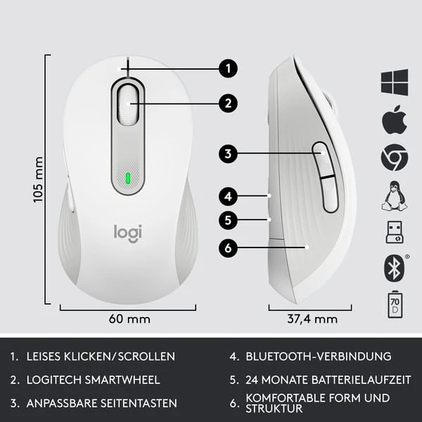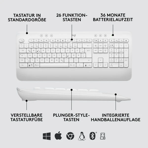 | Besonderheiten | Tastatur: bis zu 36 Monate Batterielaufzeit | Maus: 400 – 4.000 dpi, SmartWheel-Technologie, bis zu 24 Monate Batterielaufzeit | ||