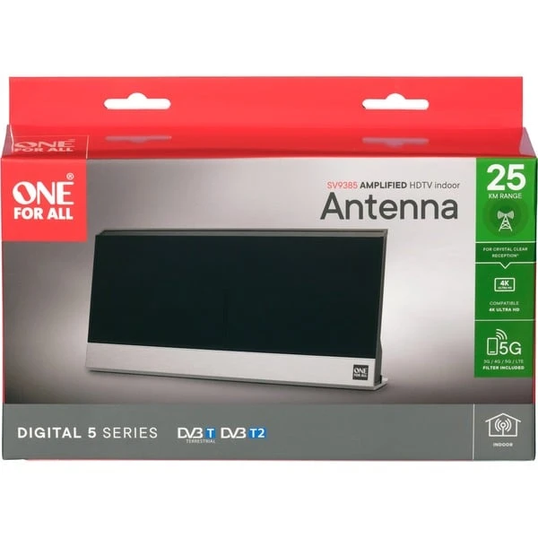Die DVB-T2 Zimmerantenne SV 9385 wurde für den optimalen Empfang von Full-HD-Digitalfernsehen optimiert und liefert dabei erhöhte Empfangswinkel sowie verbesserte Empfangskapazitäten. Die Antenne besitzt einen einzigartigen 3G/4G/5G-Blockfilter, der alle 3G, 4G und 5G-Mobilfunksignale blockiert, um einen störungsfreien Empfang sicher zu stellen.Art.-Nr.: 1810794