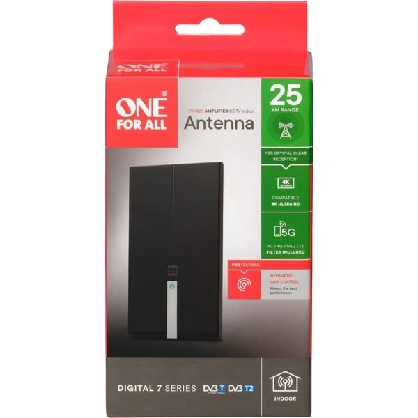 Diese Design-Antenne von One for all kann flach liegend, stehend oder an der Wand hängend installiert werden und fügt sich so in jede Umgebung ein. Sie ermöglicht selbst den Empfang von 4k Ultra HD-Programmen und unterstützt TV (DVB-T/DVB-T2). Die automatische Verstärkungsregelung sorgt für ein optimales, gleichmäßiges Ausgangssignal. Aktive 3G/4G/5G Blockfilter sorgen für minimale Interferenzen.Art.-Nr.: 1810799