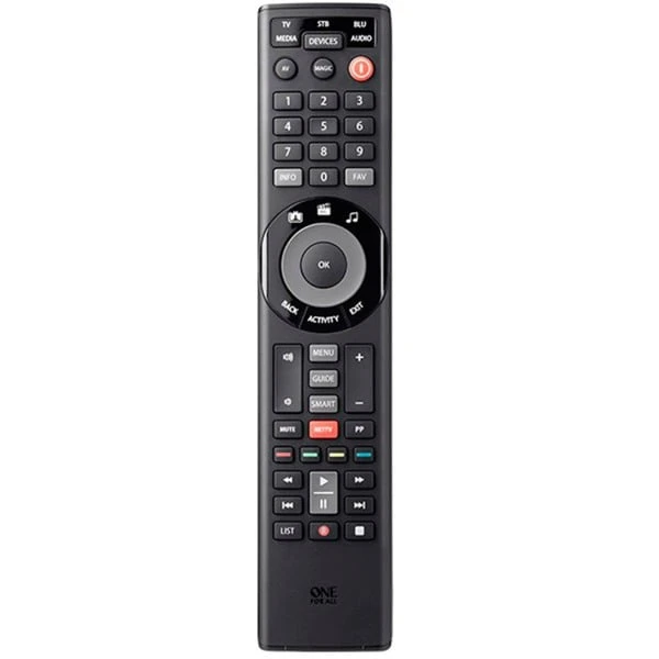 Mit der ONE FOR ALL Smart Control 5 Fernbedienung kann man bis zu fünf Geräte gleichzeitig steuern – egal ob Fernsehgerät, DVD- oder Blu-Ray Spieler, Medien- oder Streaming Client oder diverse HiFi Geräte. Die Smart Control 5 kann dabei in knapp 30 Sekunden eingerichtet werden und ist mit allen Marken kompatibel. Mit der NetTV-Taste greift man blitzschnell aus Streaming-Dienste wie z.B. Netflix oder YouTube zu, dabei zeigt die Smart Activity-Funktion an in welchem Modus man sich momentan befindet.Art.-Nr.: 1462407