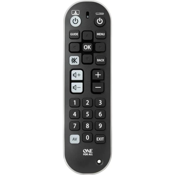 Die One For All Zapper + URC 6820 vereint Einfachheit und Komfort. Sie verfügt über alle wichtigen Tasten für normales Fernsehen, unter anderem für Menü, Programminformation und Ziffern für die direkte Auswahl des Fernsehkanals. Die ergonomisch gestaltete TV Zapper + besticht durch eine hohe Griffigkeit und Standfestigkeit auf dem Tisch. Im Lieferumfang ist zusätzlich eine Handschlaufe enthalten. Diese Fernbedienung ist optimal für alle, die die Steuerung komplexer Geräte vereinfachen möchten. Sie funktioniert mit allen Marken. Mit dem TV Zapper + kann man einfach nur den Fernseher steuern oder bei Bedarf auch die Set-Top-Box und die Soundbar. Dank zweier separater Ein/Aus-Tasten weiß man immer genau, welches Gerät gerade ein- oder ausgeschaltet wird. Die Einrichtung kann mithilfe von den in der Bedienungsanleitung angegebenen Markencodes besonders leicht vorgenommen werden. Oder man verwendet die einfache Lernfunktion, um eine beliebige Funktion eines beliebigen Geräts auf den TV Zapper + zu übertragen. Die großen farbigen Tasten ermöglichen eine optimale Navigation und geben genau an, welches Gerät gerade gesteuert wird.Art.-Nr.: 1255408
