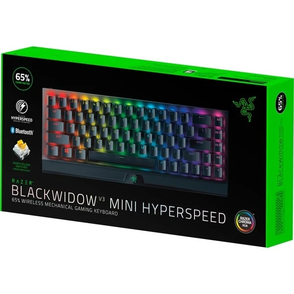 Die Razer BlackWidow V3 Mini HyperSpeed Gaming-Tastatur im eleganten, kompakten 65% Design ist ideal für minimalistische oder kompaktere Setups, bei denen jeder Quadratzentimeter zählt – und dank der Pfeiltasten muss man keine Kompromisse bei der Funktionalität machen. Sie verfügt über drei Verbindungsmodi, sodass man übergangslos zwischen dem kabellosem Gaming mit niedrigen Latenzen der Razer HyperSpeed Wireless-Technologie und der Bluetooth-Verbindung für bis zu drei Geräten wechseln oder mit dem abnehmbaren USB-C-Kabel zum Aufladen während des Spielens weitermachen kann. Die mechanischen Razer Yellow Switches der BlackWidow V3 Mini HyperSpeed sorgen für reibungsloses, schnelles und lautloses Auslösen. Schalldämpfer verringern die ohnehin schon geringe Geräuschentwicklung. Die Razer Yellow Switches ermöglichen so extrem sanfte Tastenanschläge und sorgen im Zusammenspiel mit den Tasten in voller Bauhöhe dafür, dass man beim Gamen keine Kompromisse machen muss. Dank des Doubleshot-Gussverfahrens kann sich die Beschriftung niemals abnutzen und die Tastenkappen haben extra dicke Seiten, wodurch sie extrem robust sind und auch Dauerbetrieb locker wegstecken. Dank 16,8 Millionen Farben und einer ganzen Reihe von Effekten kann man die RGB-Beleuchtung der BlackWidow V3 Mini HyperSpeed über Razer Synapse 3 mit dem Rest der Battlestation synchronisieren, damit sie dynamisch auf über 150 unterstützte Spiele reagiert.Art.-Nr.: 1751939