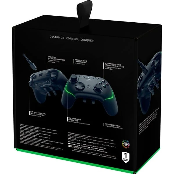 | Besonderheiten | Razer Mecha-Tactile-Aktionstasten, Rundes Razer Mecha-Tactile-Steuerkreuz, 6 multifunktionale Tasten, Austauschbare Sticks, Optionale Trigger-Stopper für Schnellfeuer, Razer Chroma RGB, Abnehmbares Kabel | ||