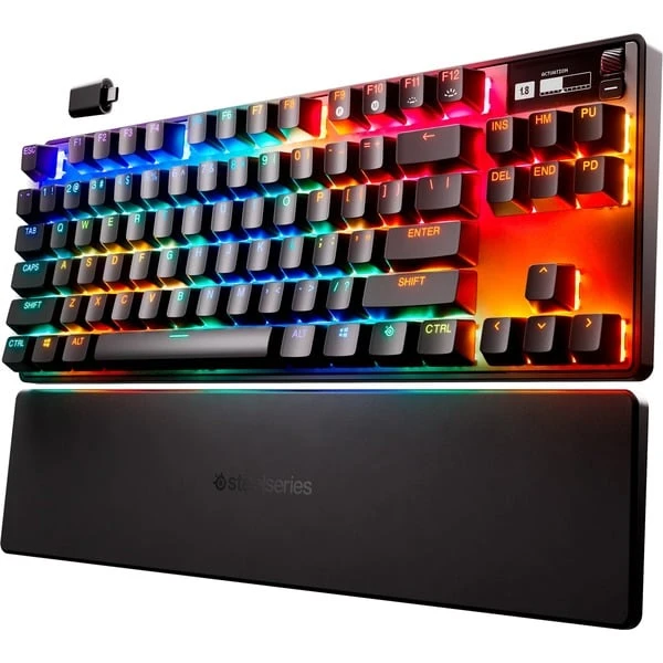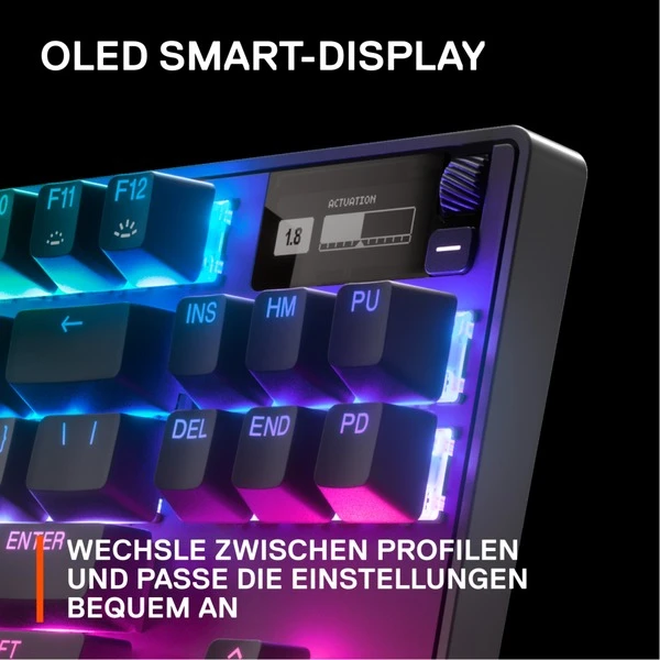 Die Gaming-Tastatur SteelSeries APEX Pro TKL Wireless ist die schnellste Tastatur aller Zeiten. Ihre weltweit schnellsten und fortschrittlichsten OmniPoint 2.0 Switches eignen sich für jeden Anwendungsfall, egal ob es darum geht, Gegner mit rasanter Geschwindigkeit zu eliminieren oder mit höchster Präzision zu tippen. Die Schalter liefern ein 11-mal schnelleres Ansprechverhalten und eine 10-mal schnellere Betätigung. Die hochmodernen Magnetsensoren sorgen für geringstmögliche Reaktionszeiten. Die Distanz bis zum Auslösen jeder Taste kann von 0,1 mm bis 4,0 mm in Abständen von 0,1 mm festgelegt werden. Für ein und dieselbe Taste lassen sich zwei Aktionen bestimmen, je nachdem, wie tief man drückt: Leichter Druck zur Vorwärtsbewegung, Durchdrücken zum Sprinten. Über das OLED Smart-Display der Apex Pro TKL Wireless kann man sich wichtige Informationen wie GPU-Auslastung oder Benachrichtigungen anzeigen lassen, zwischen Profilen hin und her wechseln und Einstellungen vornehmen. All das und vieles mehr lässt sich auch in der SteelSeries Engine anpassen. Die Double-Shot PBT-Tastenkappen bieten Langlebigkeit und erstklassige Haptik und die Deckplatte ist aus demselben robusten Aluminium gefertigt, das auch in Jets verbaut ist, um selbst höchsten Anforderungen gerecht zu werden. Die Apex Pro TKL Wireless bietet zudem unterbrechungsfreies Spielvergnügen mit der ultraschnellen, verzögerungsfreien 2,4-GHz- oder Bluetooth-5.0-Verbindung.Art.-Nr.: 1871364
