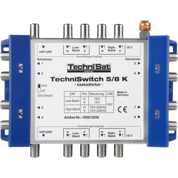 Die Kombination des Grundgerätes (TechniSwitch 5/8G) mit dieser Kaskadeeinheit ermöglicht die einfache und problemlose Erweiterung einer TechniSwitch-Verteilanlage auf bis zu 16 Teilnehmer. Dabei steht an jeder Multimedia-Steckdose die gesamte Bandbreite zur Verfügung, aus der der Teilnehmer wählen kann. Mit dieser TechniSwitch-Anlage können bis zu 4 verschiedene Satelliten-ZF-Ebenen verteilt werden.Art.-Nr.: 93218