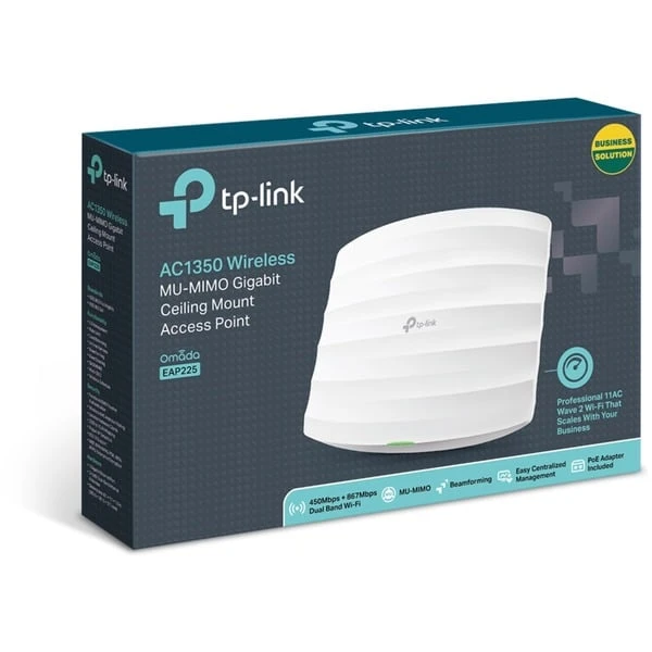 Der TP-Link Omada EAP225 ist ein AC1350-Dualband-Gigabit-Accesspoint zur Deckenmontage. Er bietet ein Simultanes Dualband mit 300 Mbit/s WLAN-Geschwindigkeit auf 2,4 GHz und 867 Mbit/s auf 5 GHz. Mit der mitgelieferten EAP-Controller-Software kann man hunderte EAPs verwalten und derOmada EAP225 unterstützt PoE nach 802.3af für einfache, kostengünstige Installation ohne das Verlegen neuer Kabel. Zudem bietet der EAP225 Captive Portal für eine sichere Zugangskontrolle und einfache Gast-Authentifizierung. Sein Band-Steering verlagert Dualband-Geräte automatisch in das weniger belegte Frequenzband.Art.-Nr.: 1303562