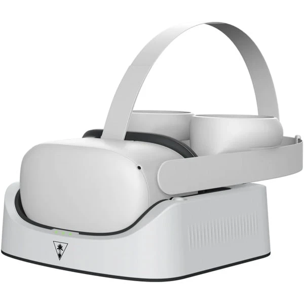 Die Turtle Beach Fuel Kompakte VR-Ladestation für Meta Quest 2 liefert zuverlässige, wiederaufladbare Energie für das Meta Quest 2 Virtual-Reality Headset und den Touch Controller. Zwei 1500-mAh-Akkus liefern jeweils bis zu 10 Stunden wiederaufladbare Energie und machen umweltschädliche Einwegbatterien überflüssig. Die geschlitzten Akkuabdeckungen an den Controllern und der mitgelieferte USB-C Magnetstift-Dongle für das Headset ermöglichen ein einfaches magnetisches Aufladen. Wenn man also auftanken muss, legt man das Headset und die Controller einfach in das Ladegerät und in ca. 2,5 Stunden ist man mit einem voll aufgeladenen Akku wieder einsatzbereit. Außerdem unterstützt die Fuel-VR-Ladestation die Schnellladefunktion, wenn man das USB-C-Stromkabel mit dem Meta Quest 2-Netzteil verbindet. Man behält den Ladestand mit der leicht ablesbaren Akkustandsanzeige im Auge. Gelbe Lichter zeigen an, dass der Ladevorgang läuft, und sobald das Licht grün wird, ist man startklar. Die kompakte Grundfläche der Station und die Kabellänge von 2 m sorgen dafür, dass das Setup übersichtlich und handlich bleibt, unabhängig davon, wo sich das VR-Setup befindet. Art.-Nr.: 1915166