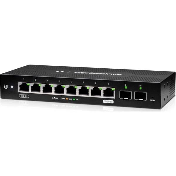 Der Ubiquiti ES-10X bietet acht Gigabit RJ45-Ports welche Kupfer-Konnektivität mit PoE-Eingang an Port 1 und PoE-Passthrough an Port 8bieten. Zwei SFP-Ports bieten Glasfaserverbindung. Der EdgeSwitch 10X verbraucht 50% weniger Strom als der EdgeSwitch XP der Vorgängergeneration und ermöglicht so eine passive Kühlung. Art.-Nr.: 1484523