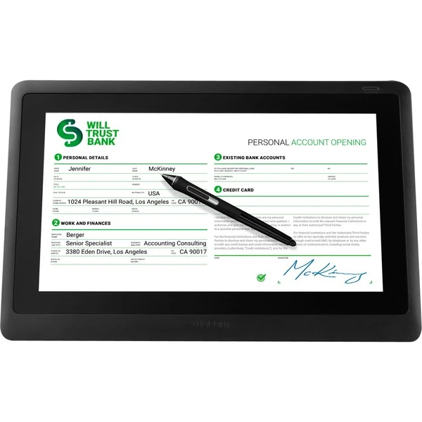 Das Wacom DTK-1660E ist mit seinem 15,6 Zoll großen IPS-LCD-Display mit Full-HD-Auflösung ein Premium-Stift-Display, mit dem Unternehmen optimale papierlose Abläufe für persönliche Kundeninteraktionen realisieren können. Das DTK-1660E bietet modernste Verschlüsselung und einen digitalen Stift mit 8.192 Druckstufen für die biometrisch genaue Erfassung von elektronischen Unterschriften. Es kann im Hoch- oder Querformat genutzt werden und bietet eine Vollbilddarstellung von Dokumenten im A4- und Letter-Format ohne Verkleinern/Scrollen der Anzeige. Zudem lässt sich das DTK-1660E intuitiv bedienen und dank des 3-in-1-Anschlusskabels einfach und übersichtlich installieren.Art.-Nr.: 1565703